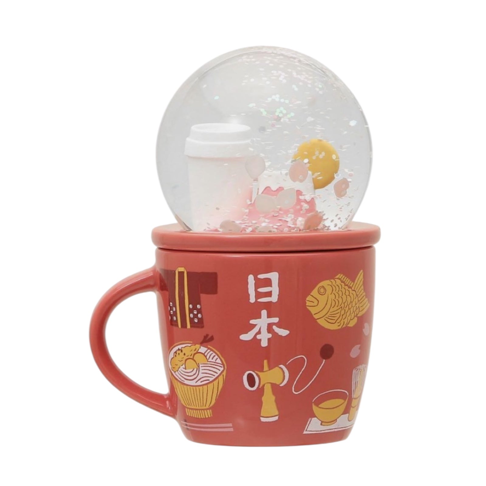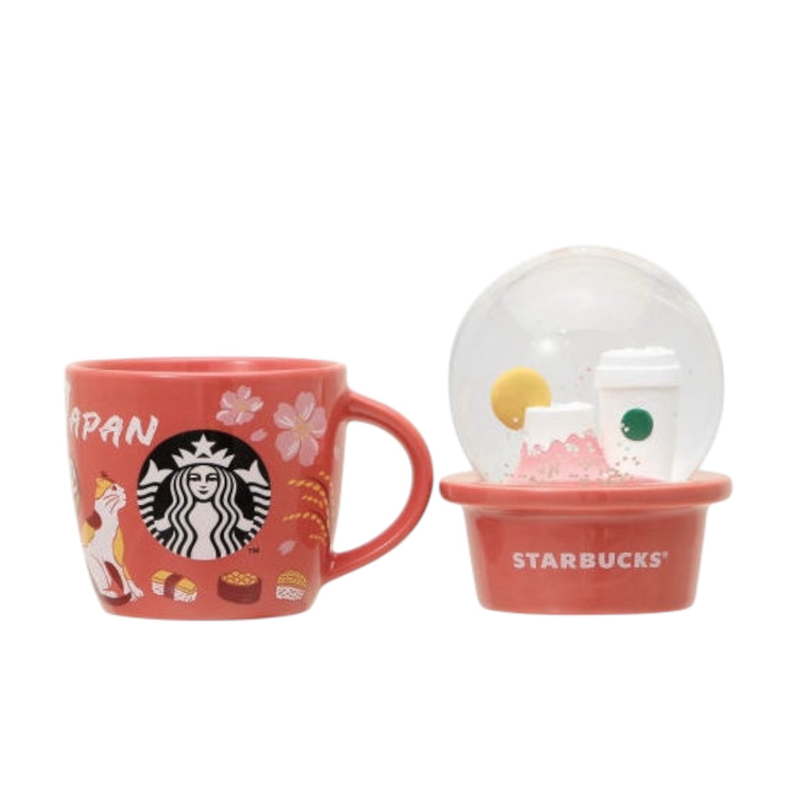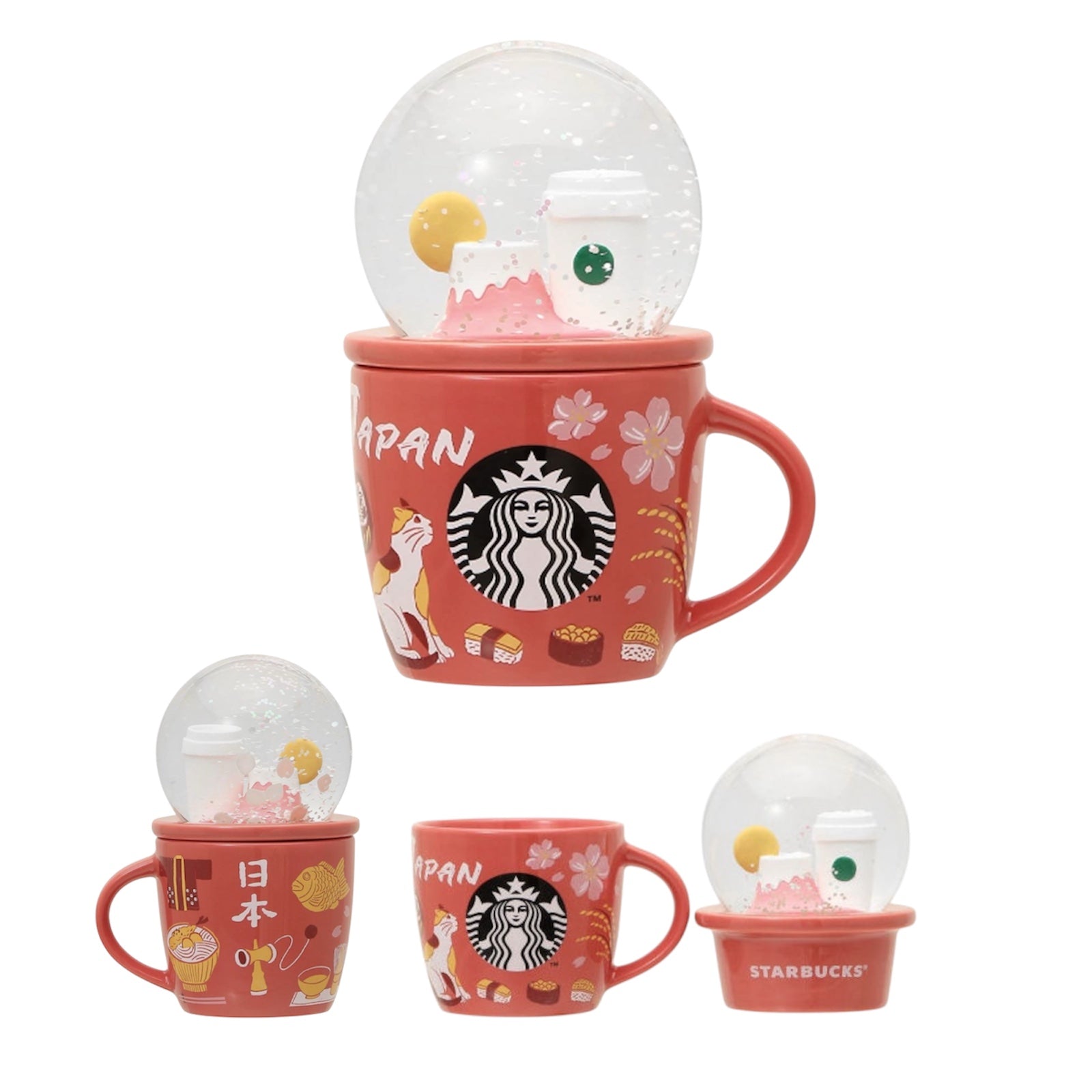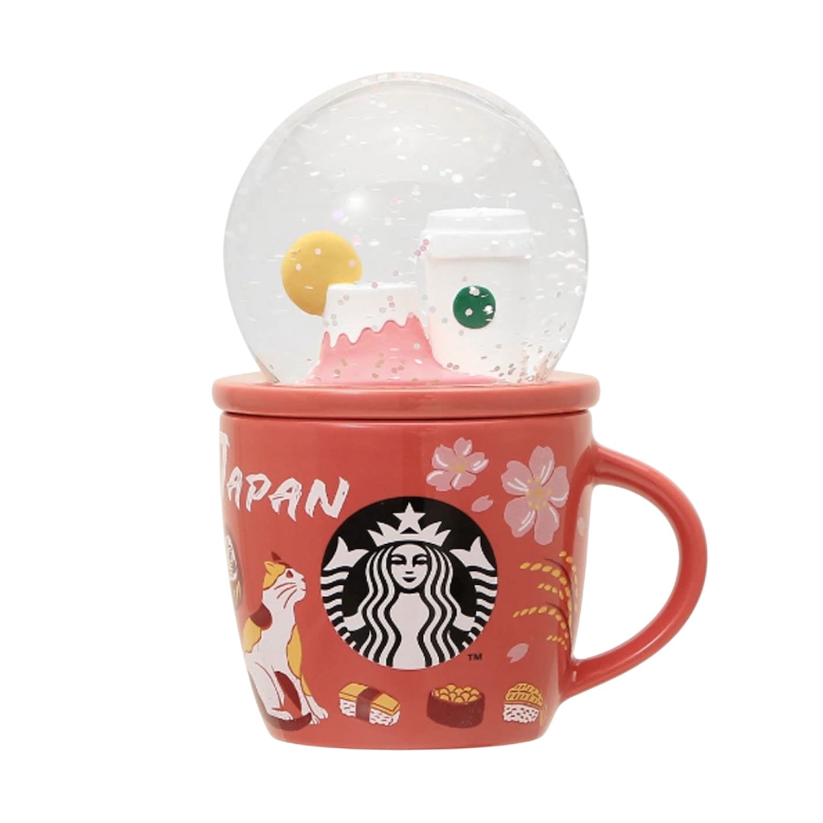 Starbucks Japan Limited Collectible Snow Globe & Mug (89ml), featuring Japanese motifs such as Mount Fuji, cherry blossoms, sushi, and a miken cat.