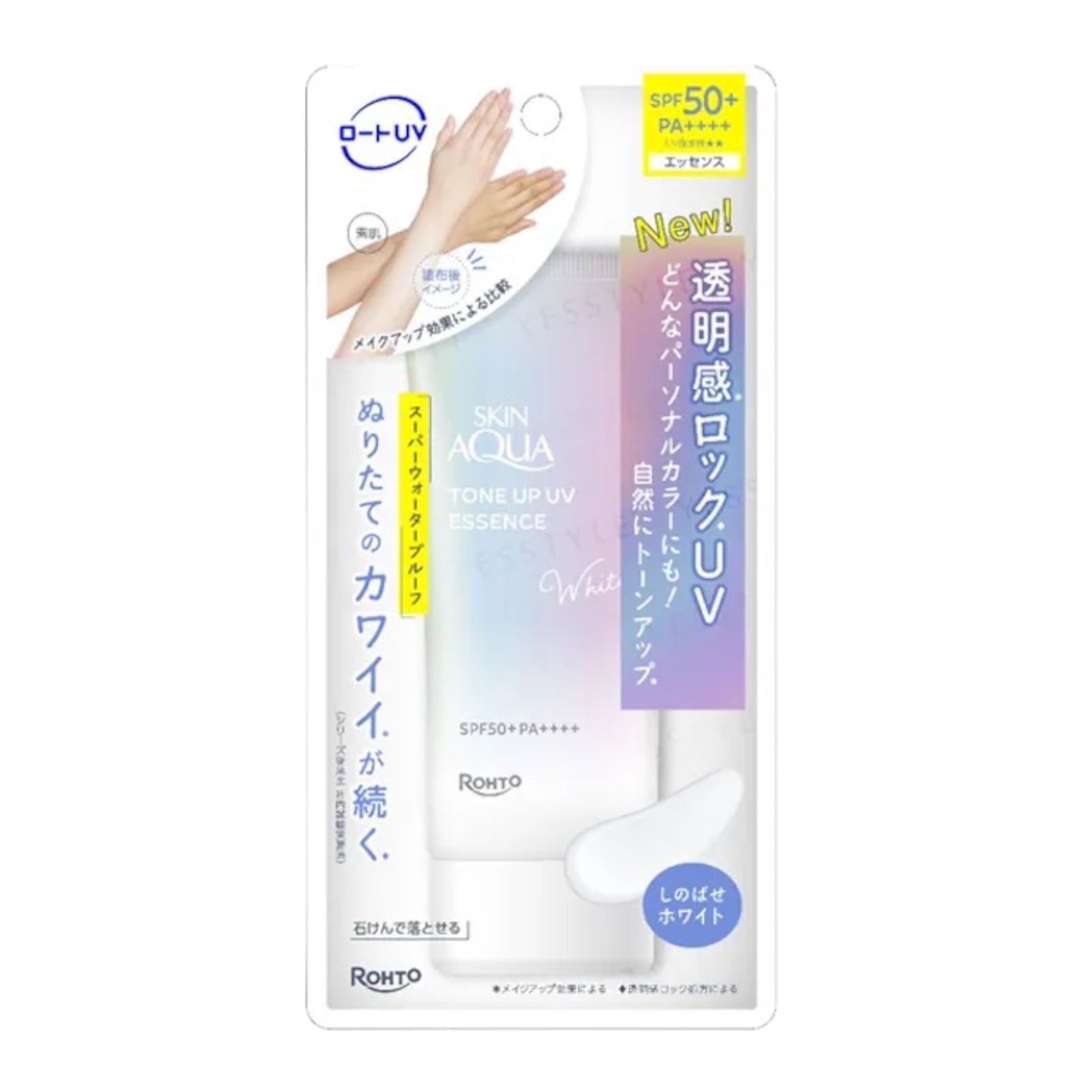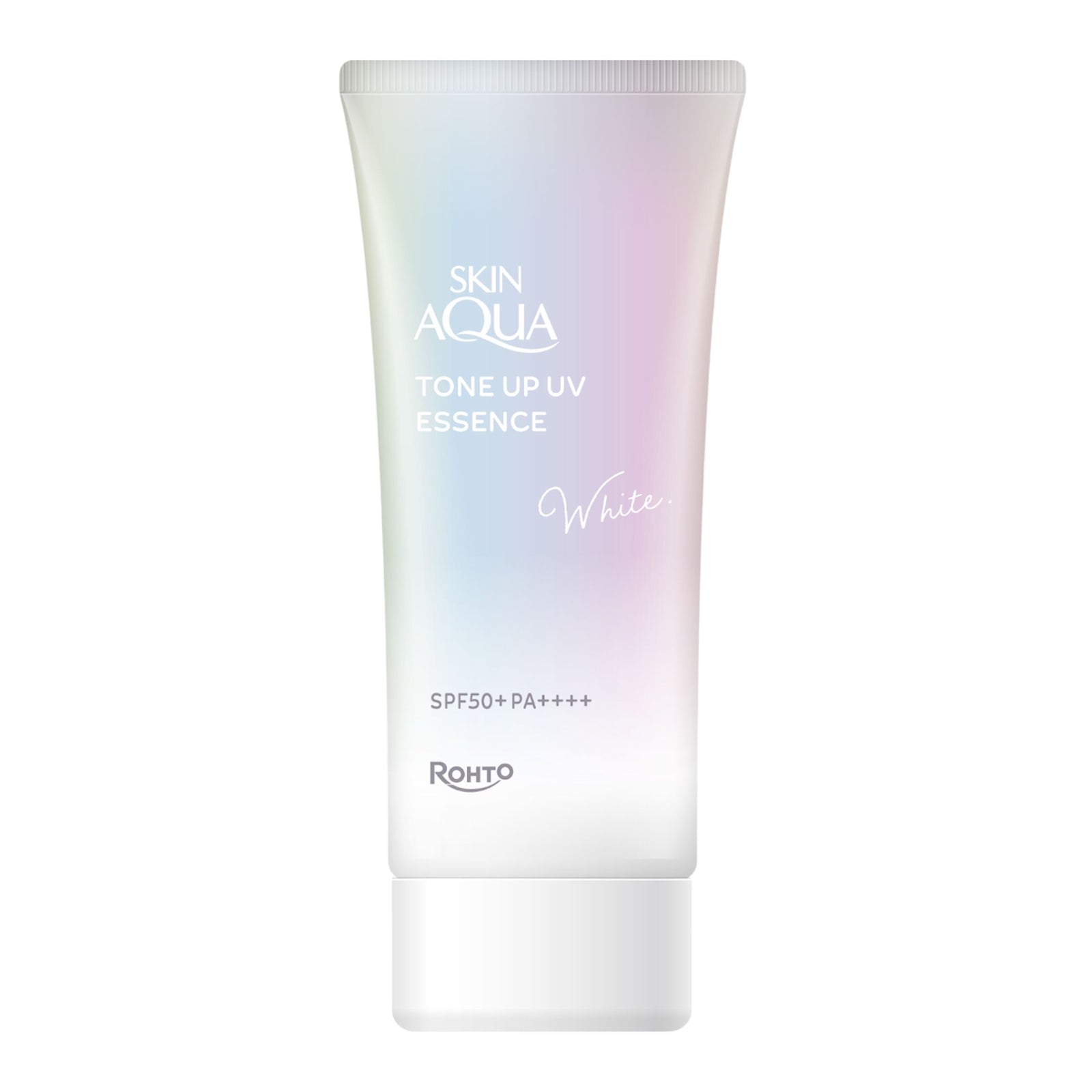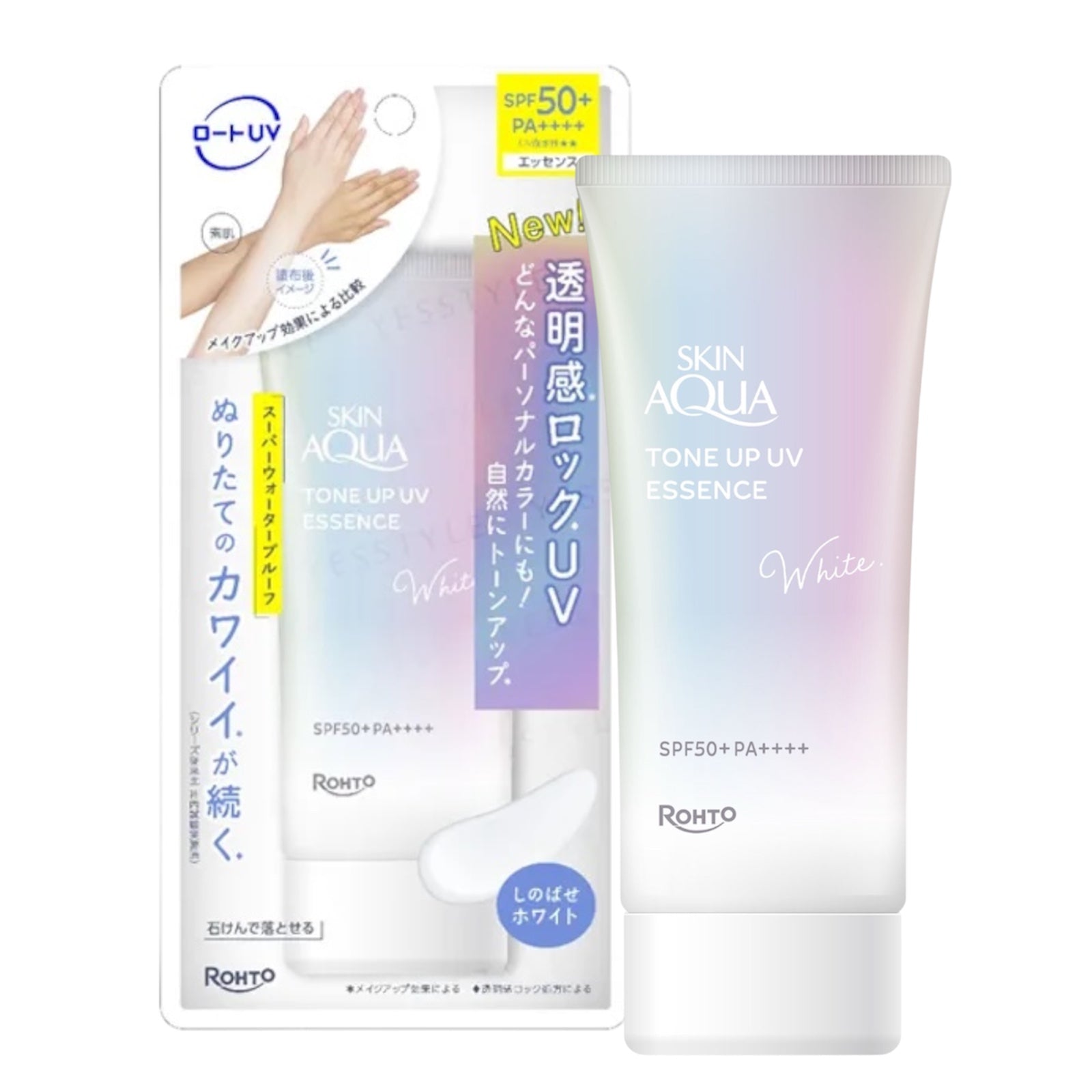 Rohto Skin Aqua Tone Up UV Essence White SPF50+ PA++++ sunscreen for face and body that provides UV protection while subtly brightening your complexion.